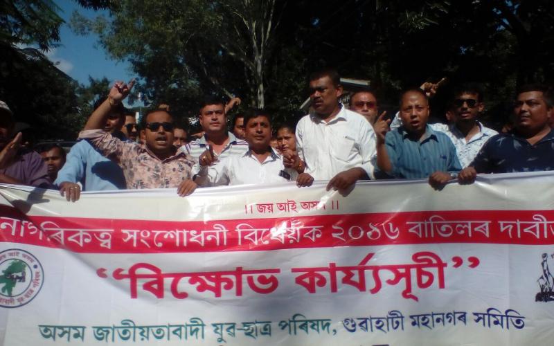 'নাগৰিকত্ব সংশোধনী বিধেয়ক-২০১৬'ৰ বিৰোধিতাৰে গুৱাহাটীত বিক্ষোভ কাৰ্যসূচী ৰূপায়ণ কৰা হয়।অসম জাতীয়তাবাদী যুৱ-ছাত্ৰ পৰিষদৰ মহানগৰ জিলা সমিতিয়ে ৰূপায়ণ কৰা এই বিক্ষোভ কাৰ্যসূচীত অংশগ্ৰহণ কৰে সংগঠনটোৰ দুই শতাধিক সদস্যই।মহানগৰ জিলা উপায়ুক্ত কাৰ্যালয়ৰ সম্মুখত ৰূপায়ণ কৰা প্ৰতিবাদী কাৰ্যসূচীত অংশগ্ৰহণ কৰি সদস্যসকলে 'সোণোৱাল চৰকাৰ হায় হায়,জাতিধ্বংসী নাগৰিকত্ব সংশোধনী বিধেয়ক বাতিল কৰক,মোডী চৰকাৰক হুচিয়াৰ' শ্লোগানেৰে মেঘদূত ভৱনৰ সন্মুখভাগ উত্তাল কৰি তোলে। ইফালে,প্ৰতিবাদী কাৰ্যসূচীত অংশগ্ৰহণ কৰি মহানগৰ জিলা সমিতিৰ আহ্বায়ক প্ৰদীপ কলিতাই কয়-'নাগৰিকত্ব সংশোধনী বিধেয়কৰ জৰিয়তে লাখ লাখ হিন্দু বাংলাদেশীক অসমত সংস্থাপন কৰিব কৰিব বিচৰা কাৰ্যক কেতিয়াও সফল হবলৈ দিয়া নহব।হিন্দুৱেই হওঁক বা মুছলমানে হওঁক বিদেশী বিদেশীয়ে। গতিকে ৭১ৰ পিছত অহা সকলো বিদেশীয়ে অসম এৰি যাবই লাগিব।' কেবৰ জড়িয়তে অসমীয়া জাতিক নিঃশেষ কৰিবলৈ বিচৰা বুলি অভিযোগ তুলি আহ্বায়ক কলিতাই কয়-'পূৰ্বতেও আমি এই বিধেয়কৰ বিৰুদ্ধে ওলাই আহিছোঁ।সেই পূৰ্বৰ স্থিতি আমাৰ অটল আছে।প্ৰয়োজন হ'লে শেষ মুহূৰ্তলৈকে শেষ মুহূৰ্ত শেষ বিন্দু তেজ থকালৈকে আন্দোলন অব্যাহত থাকিব।' 'অসম আৰু ত্ৰিপুৰাৰ বাহিৰে উত্তৰ-পূৰ্বাঞ্চলৰ সকলো ৰাজ্যই ইয়াৰ বিৰোধিতা কৰিছে।মূলত: অসমক টাৰ্গেট কৰিয়ে এই বিধেয়ক কেন্দ্ৰৰ বিজেপি চৰকাৰে আনিবলৈ বিচাৰিছে বুলি প্ৰকাশ কৰে আহ্বায়ক কলিতাই। উল্লেখ্য যে এই বিক্ষোভ কাৰ্যসূচীৰ পিছতে পুনৰ পৰৱৰ্তী কেব বিৰোধী আন্দোলনৰ কথাও ঘোষণা কৰে মহানগৰ জিলা সমিতিয়ে।সেই অনুসৰি অহা ২০ নৱেম্বৰত গুৱাহাটী মহানগৰৰ ১০ খন আঞ্চলিক সমিতিয়ে মহানগৰৰ বিভিন্ন স্থানত জোঁৰ সমদল কাৰ্যসূচী ৰূপায়ণ কৰিব।