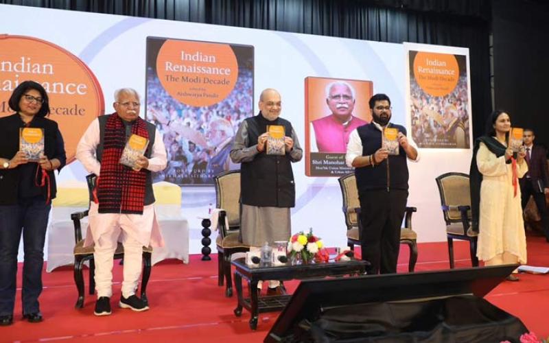 Dr Aishwarya Pandit Sharma, Chairperson of The Sunday Guardian Foundation, has edited a book titled 'Indian Renaissance: The Modi Decade'. The book was released by Union Home Minister Amit Shah at the NDMC Center in Delhi. Union Housing and Urban Development Minister Manohar Lal was also present as a special guest on this occasion.