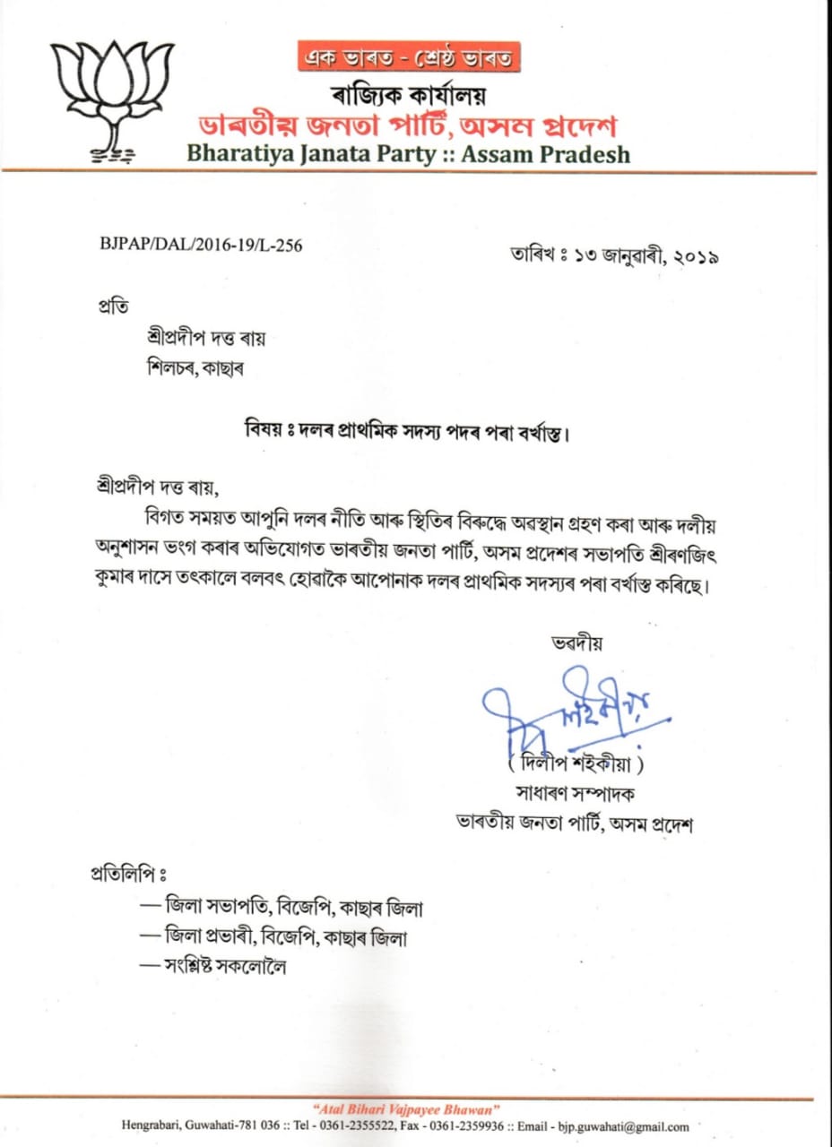 তাৰ ফলশ্ৰুতিতে বিজেপিৰ ৰাজ্যিক নেতৃত্বই প্ৰদীপ দত্ত ৰায়ক দলৰ পৰা বহিষ্কাৰ কৰিবলগা হয়৷ আজি ৰাজ্যিক বিজেপিৰ সভাপতি ৰণজিৎ কুমাৰ দাসে প্ৰদীপ দত্ত ৰায়ক দলৰ প্ৰাথমিক সদস্য পদৰ পৰা বৰ্খাস্ত কৰে৷ ৰাজ্যিক বিজেপিৰ সাধাৰণ সম্পাদক দিলীপ শইকীয়া স্বাক্ষৰিত বৰ্খাস্তকৰণ পত্ৰত এই কথা প্ৰকাশ৷ দলৰ নীতি আৰু স্থিতিৰ বিৰুদ্ধে অৱস্থান গ্ৰহণ কৰা আৰু দলীয় অনুশাসন ভংগ কৰাৰ অভিযোগত তেওঁক ৰাজ্যিক বিজেপিৰ সভাপতি ৰণজিৎ কুমাৰ দাসে তৎকালে বলৱৎ হোৱাকৈ বৰ্খাস্ত কৰা বুলি ইয়াত প্ৰকাশ৷