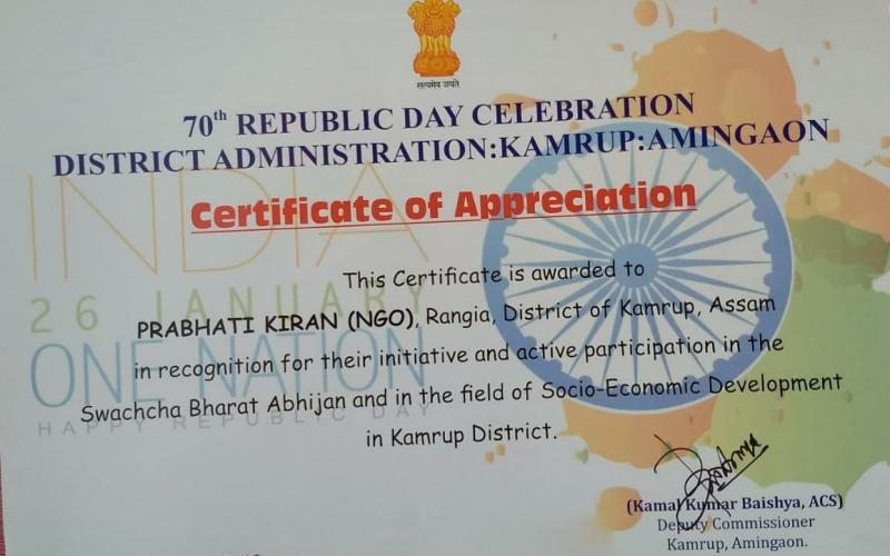 আজি গণৰাজ্য দিৱসৰ কাৰ্যসূচীত কামৰূপ (গ্ৰা) জিলাৰ উপায়ুক্ত কমল বৈশ্য আৰু অসম চৰকাৰ উদ্যোগ মন্ত্ৰী চন্দ্ৰ মোহন পাটোৱাৰীয়ে স্বেচ্ছাসেৱী অনুষ্ঠানটোক গামোচা আৰু শৰাইৰ সৈতে এখন মানপত্ৰ প্ৰদান কৰে। স্বেচ্ছাসেৱী অনুষ্ঠানটোৰ সদস্যসকলৰ সৈতে এই বঁটা গ্ৰহণ কৰে প্ৰভাতী কিৰণৰ সভাপতি মৃদুল শৰ্মা আৰু সাধাৰণ সম্পাদক ধনমণি দত্তই।
